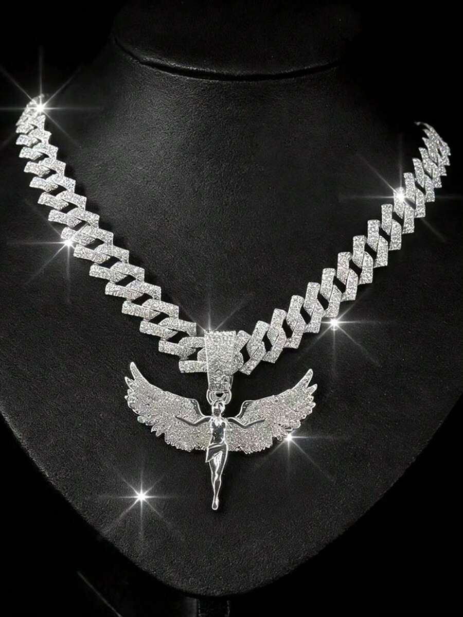 1pc Unisex Fully Rhinestone Angel Pendant Necklace, Fashionable Student Accessory
