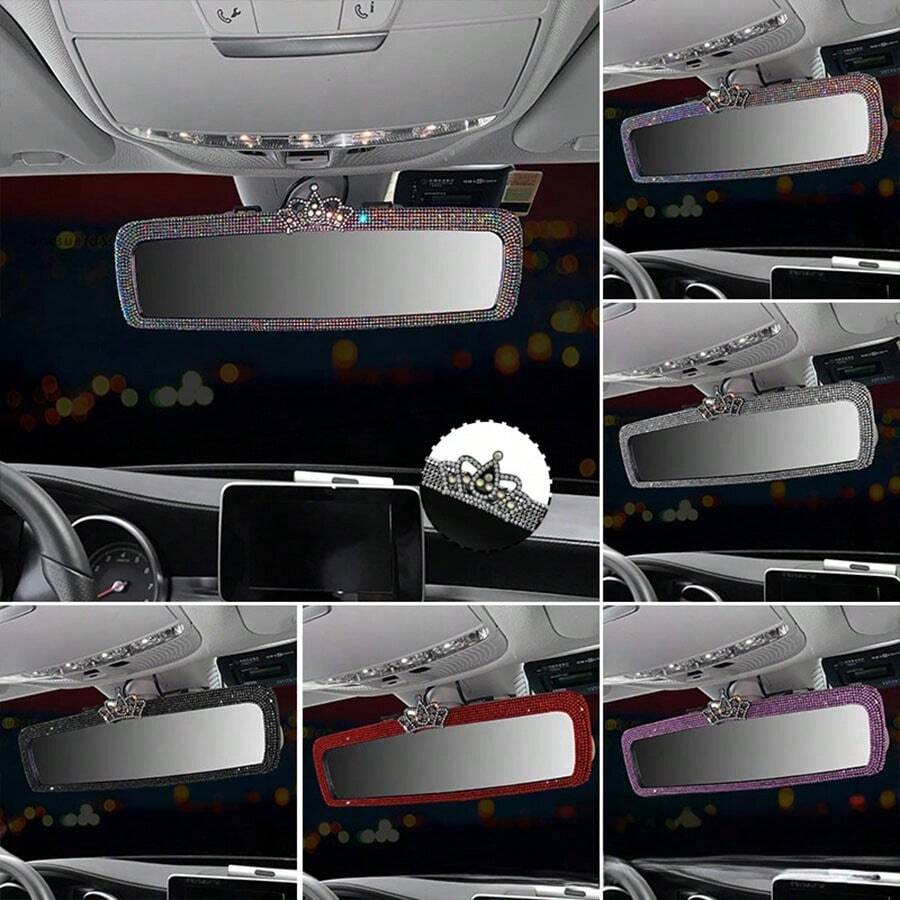 1pc Universal Rhinestone Crystal Car Rear View Mirror With Crown, Oblong Shape, Non-Prescription Glasses, Sparkling Rhinestone Interior Accessories Suitable For Most Cars
