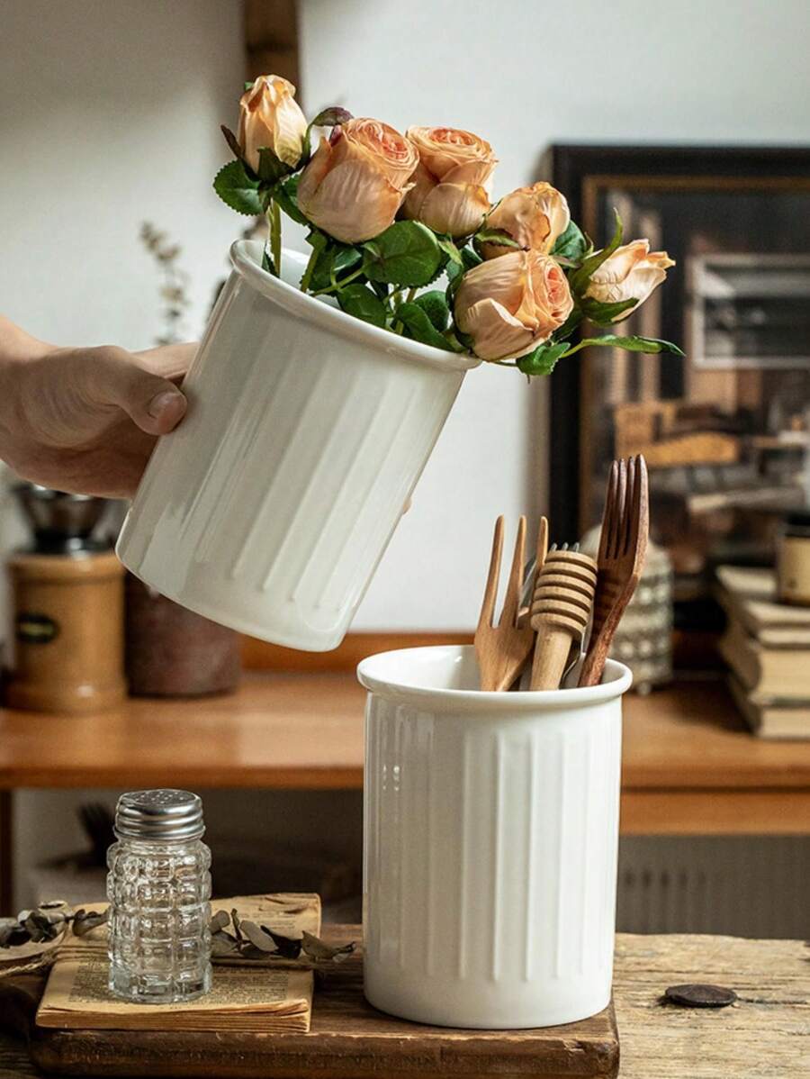 1pc White Relief Ceramic Chopsticks Holder, Spoon Rest, Storage Tube, Pencil Holder, Flower Vase, Space-Saving Kitchen Utensil Rack, Multi-Functional Knife Storage Rack, Home And Kitchen Decorative Storage Box,Christmas Gift