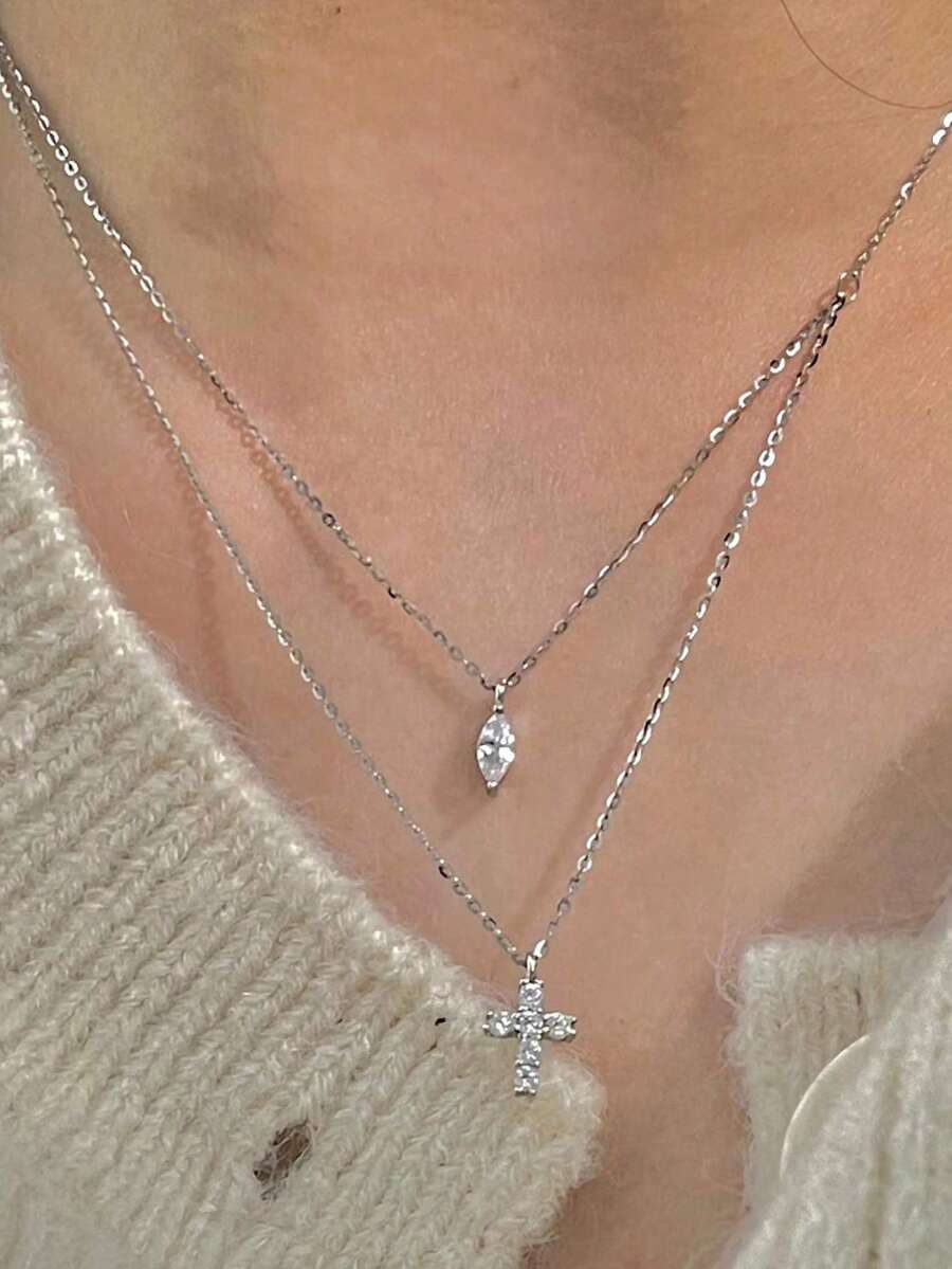 Nooxian 1pc Women's Double Layer Cubic Zirconia Water Drop Cross Pendant Necklace