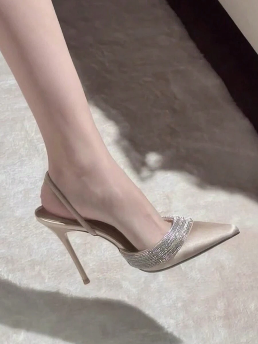 2025 Spring & Autumn New Purple Sharp Toe Thin High Heel Shallow Satin Rhinestone Strap Mule Sandals For Women,Elegant,Party