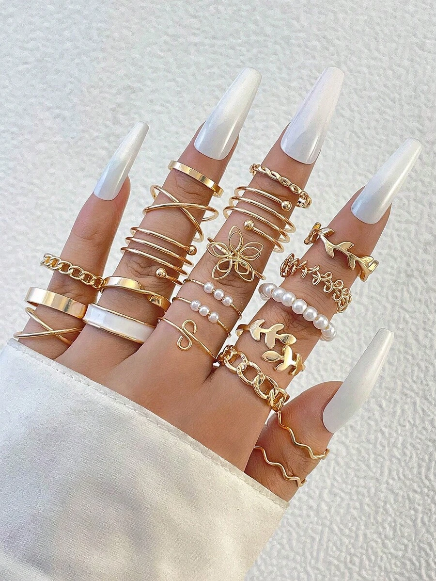 imoli 21pcs Simple & Casual Alloy Flower & Pearl Ring Set, Suitable For Everyday Wear