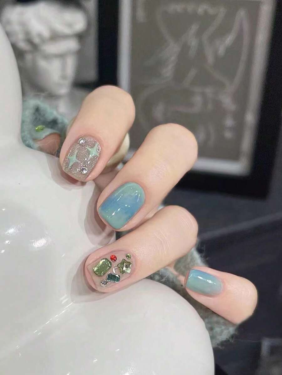24pcs Short Square Press-On Nails With Colorful Rhinestone & Glitter Design, Ocean-Themed Blue Glitter Finish, Reusable Nail Sticker With Adhesive