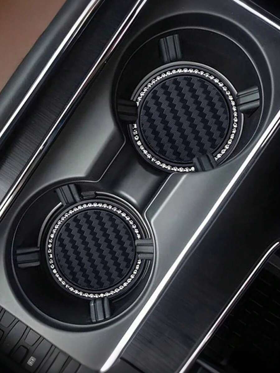 2Pcs Rhinestone-Encrusted Coasters – Car Cup Holder Liner With Crystal Trim,Carbon Fiber Pattern, Anti-Slip Universal Fit For Center Console, Durable PVC & Soft Silicone Insert