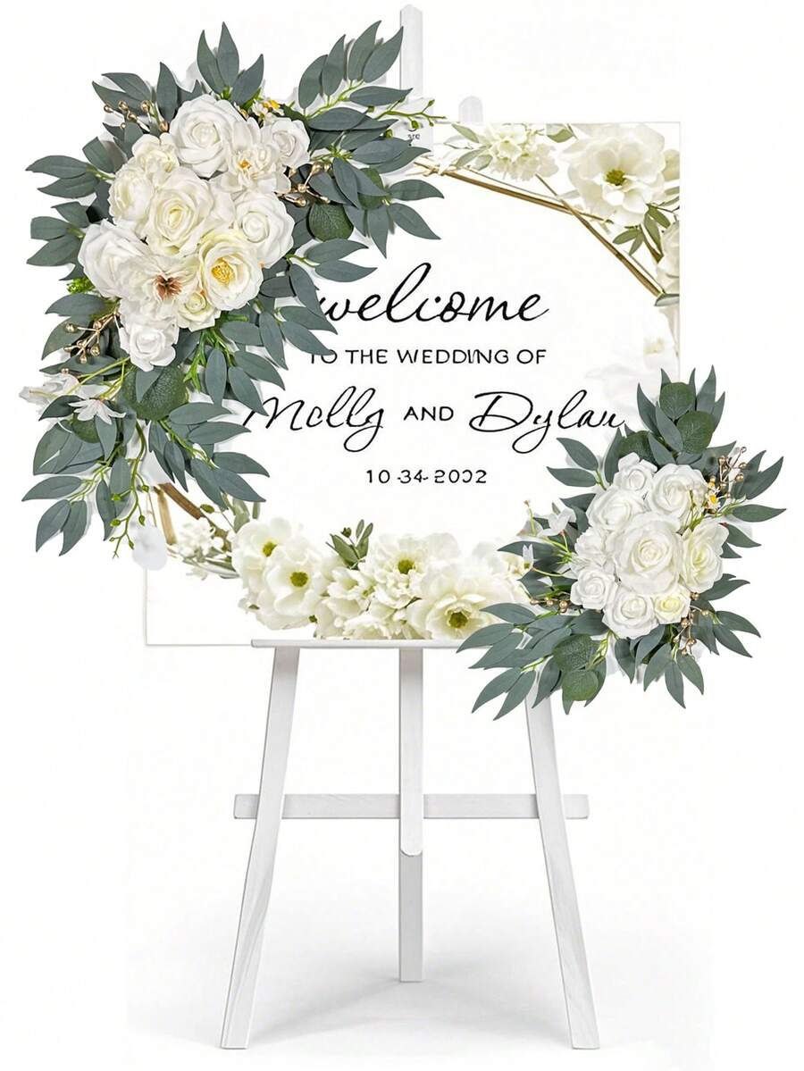 2pcs-Faux Flower Swag Set Of 2 For Wedding Welcome Signs Floral Swag Wedding Reception Ceremony Signs Decor (White)