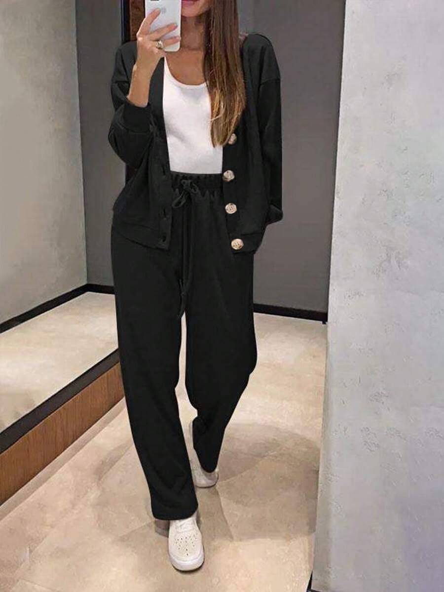 2pcs Women Sports & Casual Knit Cardigan Jacket (Button Style) And Drawstring Pants Set