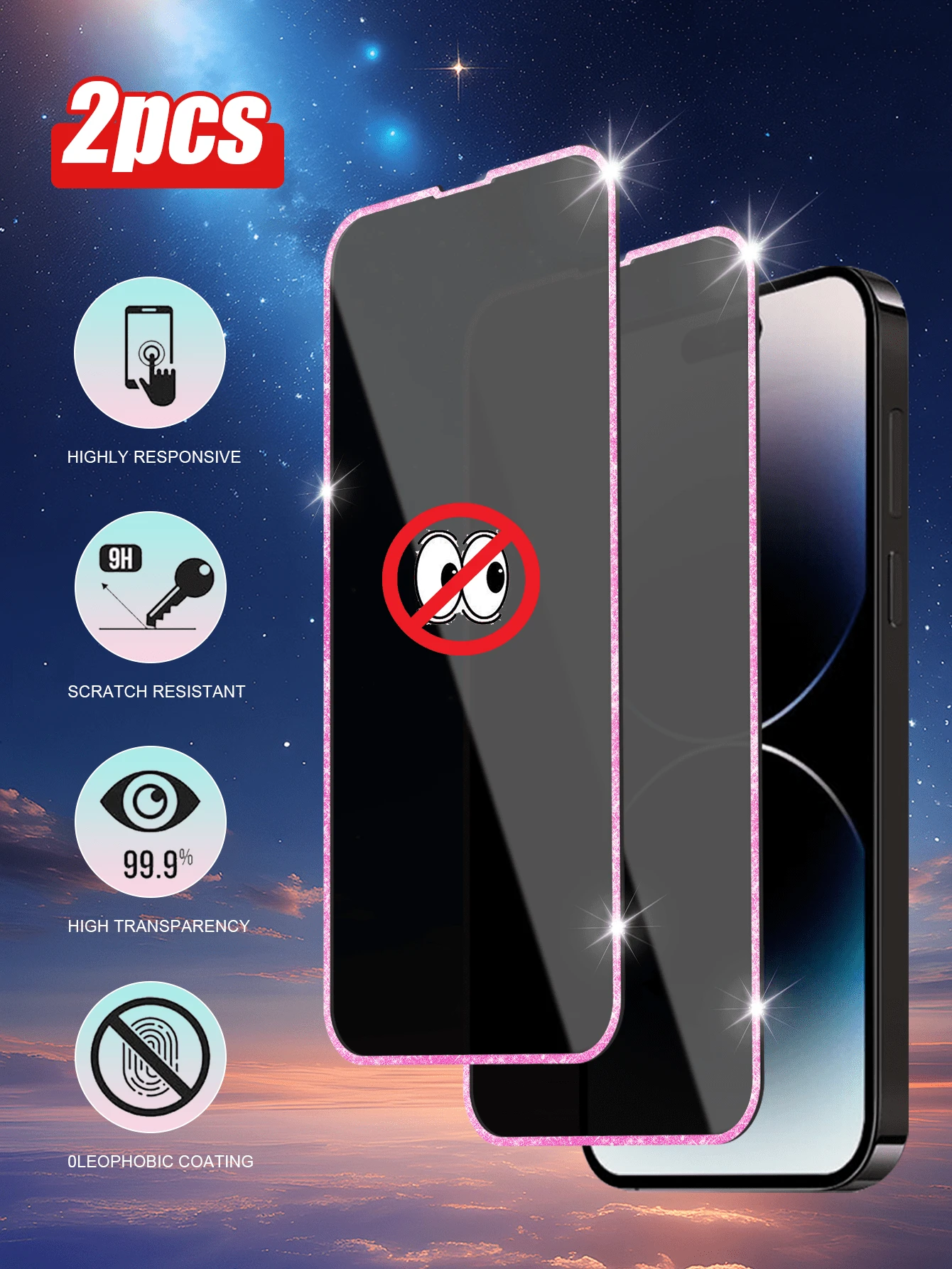 2pcs Pink Shiny Diamond Edge Tempered Glass Screen Protector, Anti-Spy Anti-Peeping, Compatible With Apple 11/12/13/14/15 Pro Max/16 Plus/16 Pro/16 Pro Max/16e/17/17 Air/17 Pro/17 Pro Max