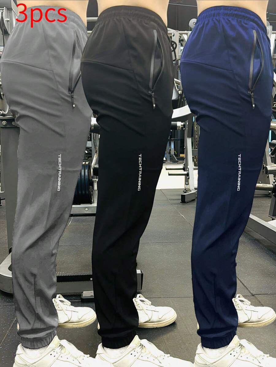 3pcs Boyfriend Style Men's Cycling Pants With Zipper Pockets, Outdoor Sports Drawstring Jogging Trousers