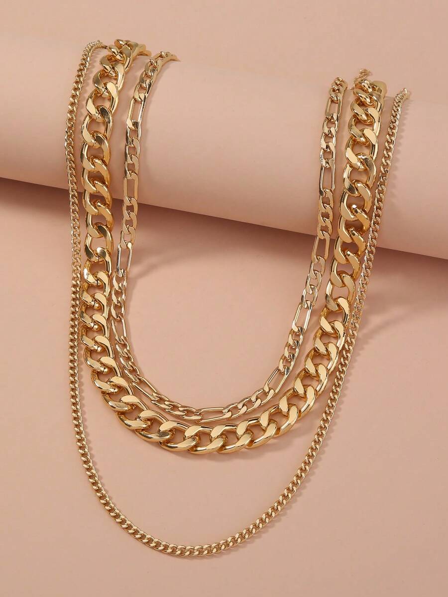 3pcs/Set Gold-Tone Multi-Layer Chunky Chain Necklace Set For Women, Fashionable Punk Hiphop Style Layered Chain Necklaces Gift (Chain, Circle Buckle And Bead Quantity Random)
