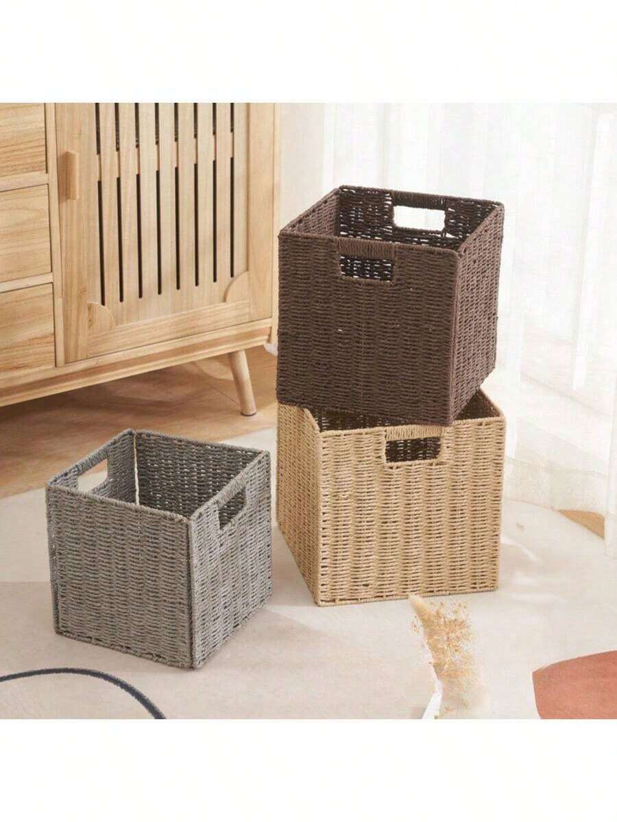 4pcs Foldable Paper Rope Storage Baskets With Handles, Rectangular Collapsible Woven Storage Boxes, Suitable For Organizing Shelves, Living Room, Bedroom, Food Storage, Suitable For Ramadan And Eid Al-Fitr Decoration