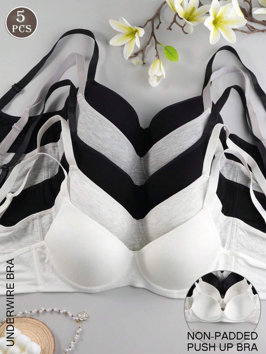 5pcs/Set Solid Color Underwire Bras, Sexy & Comfortable Push-Up Bras - Unpadded, Adjustable Straps