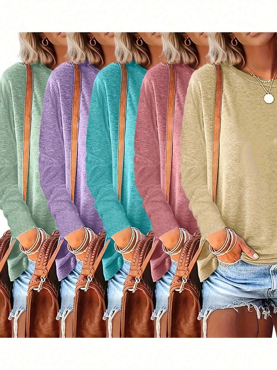 5pcs Solid Color Round Neck Long Sleeve Loose Casual Women Tops Tees, Suitable For Spring/Autumn Daily And Home Wear, Machine Washable