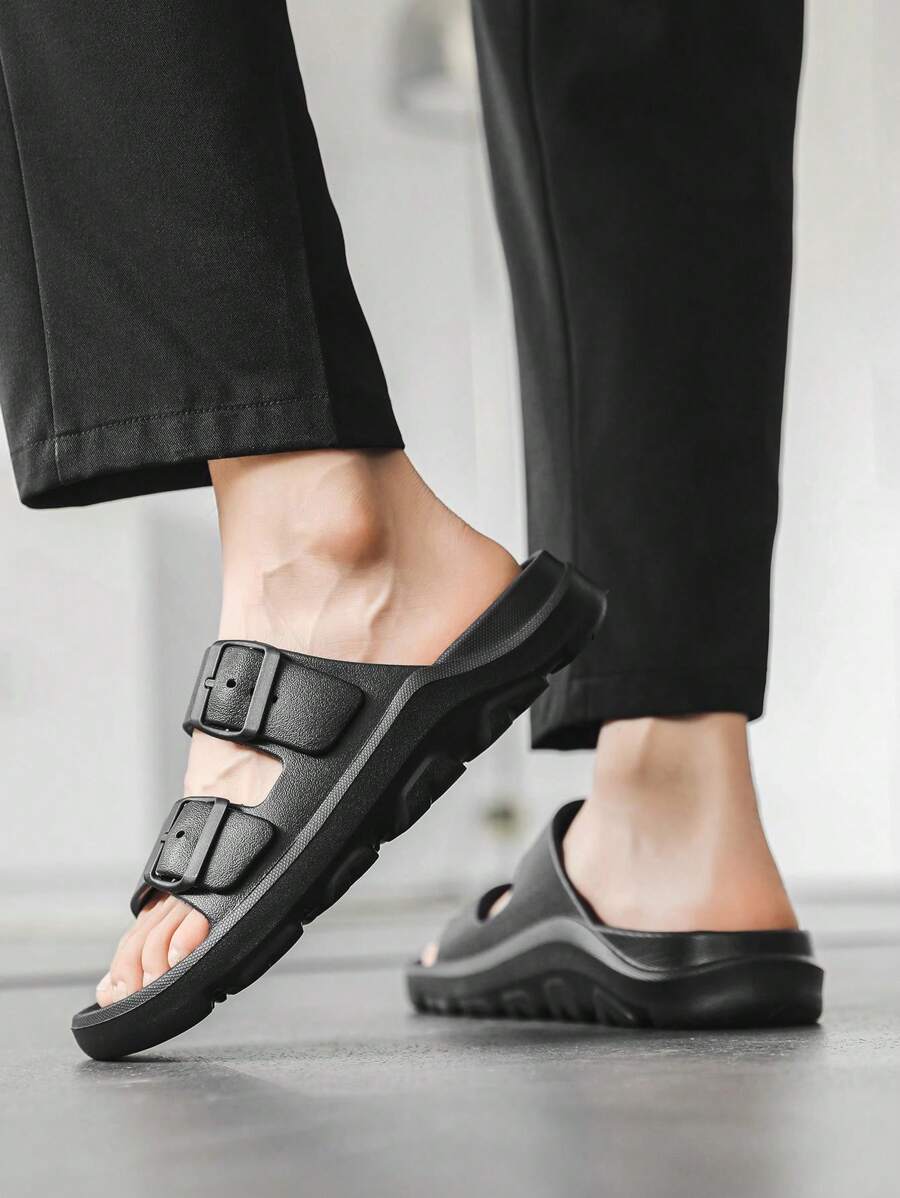 A Pair Of Men's Soft And Comfortable Double Buckle Open Toe Slippers With Backless Design
