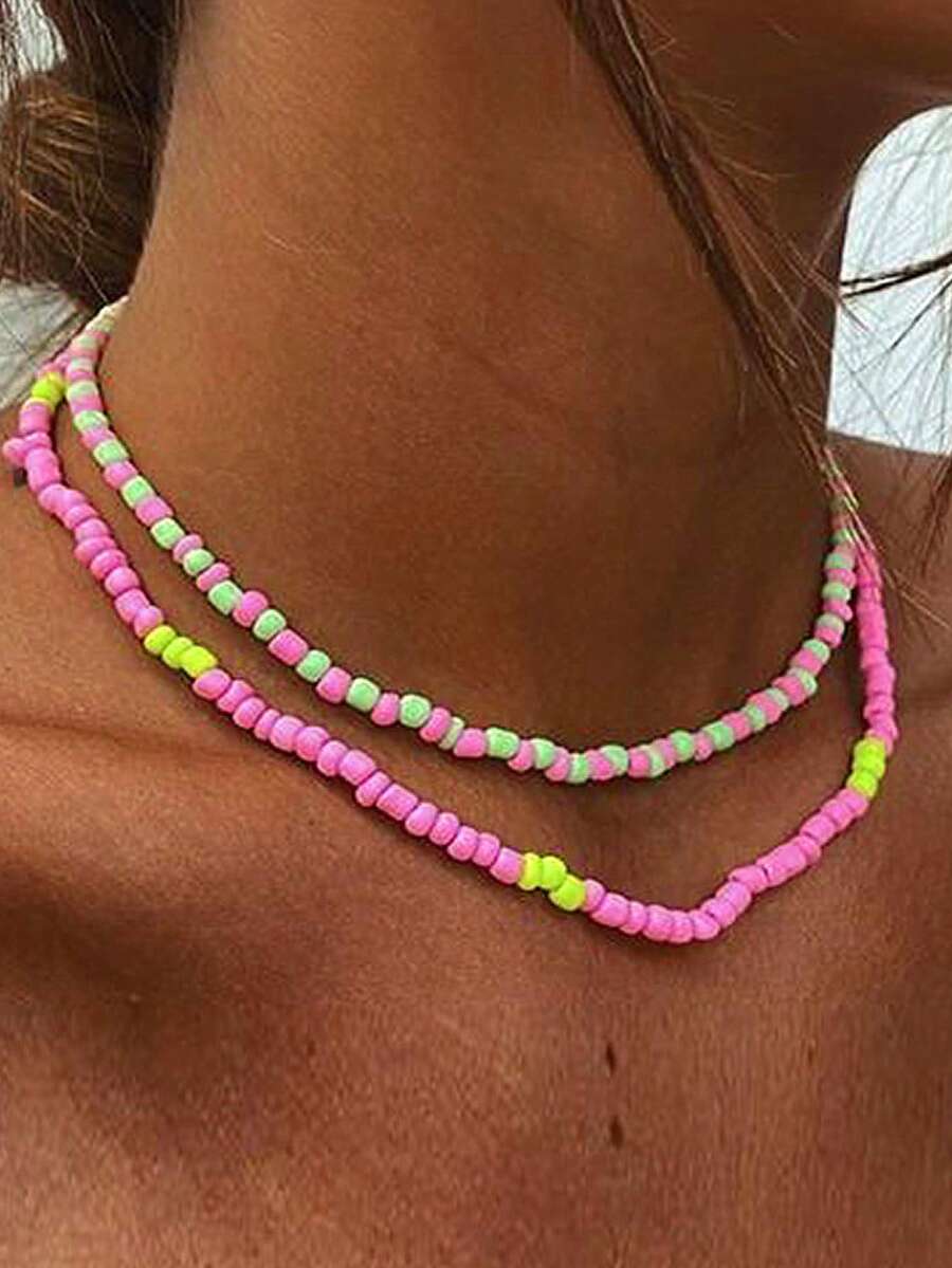 A Set Of 2 Double-Layer Colorful Beaded Women's Linked Necklaces For Decoration, Suitable For Wearing At Vacation Parties