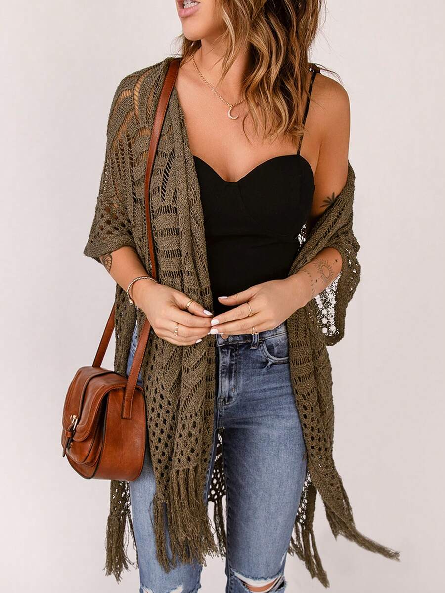 Acelitt Fringe Hem Hollow Out Kimono Summer