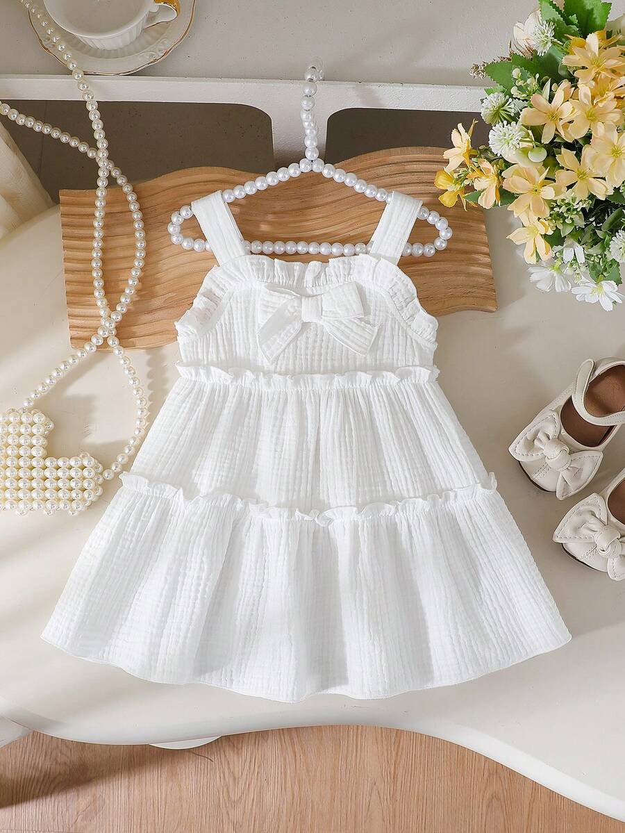 Baby Girl Spaghetti Strap Ruffle Bow A-Line Cake Dress, Suitable For Daily Outings In Spring/Summer