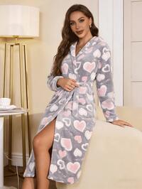 Women's Heart Print Hooded Loungewear, Pink & Gray Heart Pattern Long Sleeve Loose Hooded Robe, Thick Long Sleeve Casual Sleepwear, Women's Winter Bathrobe, Suitable For Outdoor Activities, Camping, Home, Bathroom, Living Room, Kitchen In Winter, Valentine's Day Gift, Women's Gift, Personalized Gift #5 Bestseller