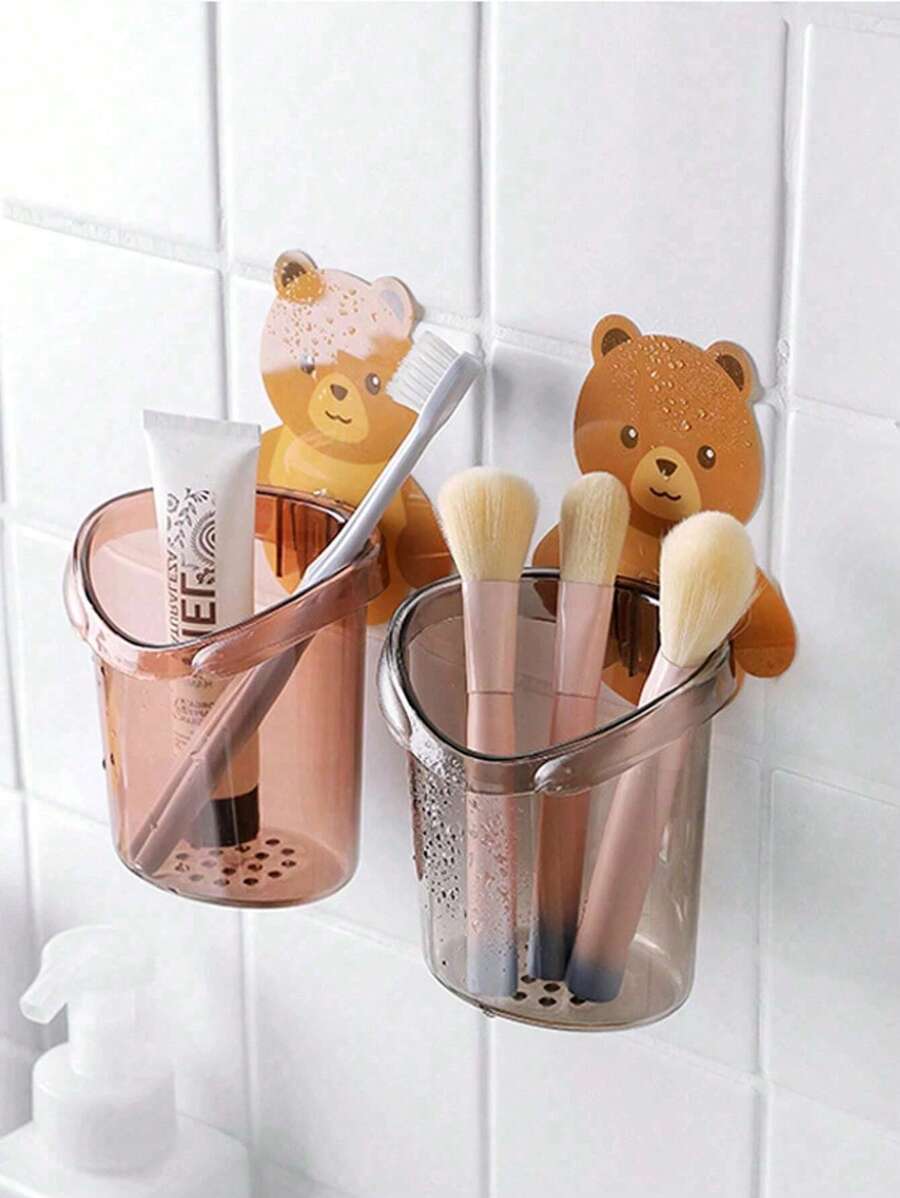 Bathroom Toothbrush, Toothpaste Holder, Wall-Mounted Draining Cup With Bear Decor No-Drill