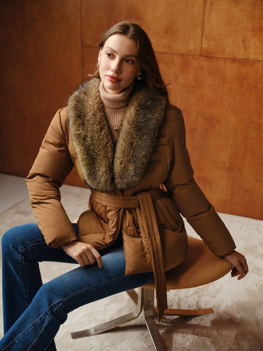 MOTF PREMIUM CONTRAST FUZZY COLLAR BELTED PADDED COAT