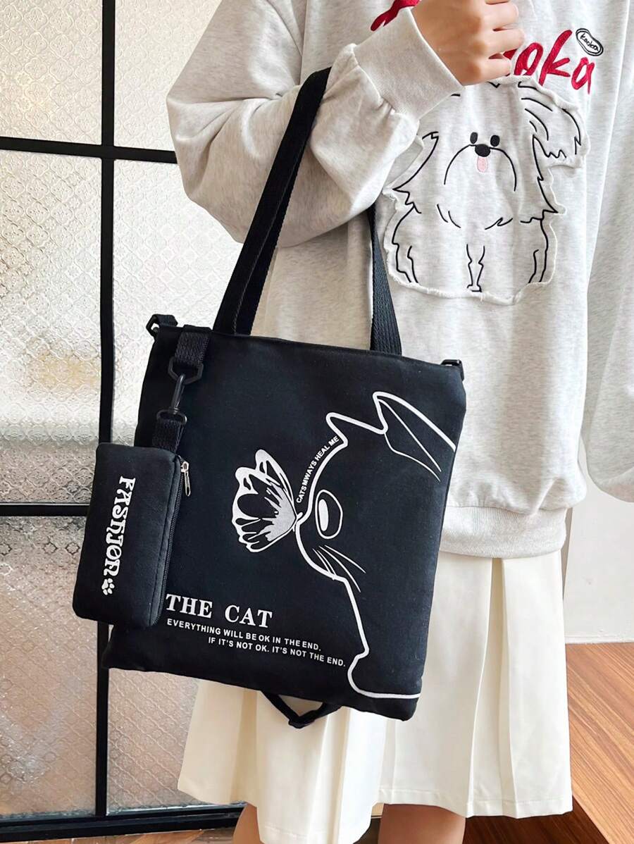 Cartoon Print Canvas Tote Bag, Suitable For Students & Casual Use, Large Capacity Shoulder Messenger Bag