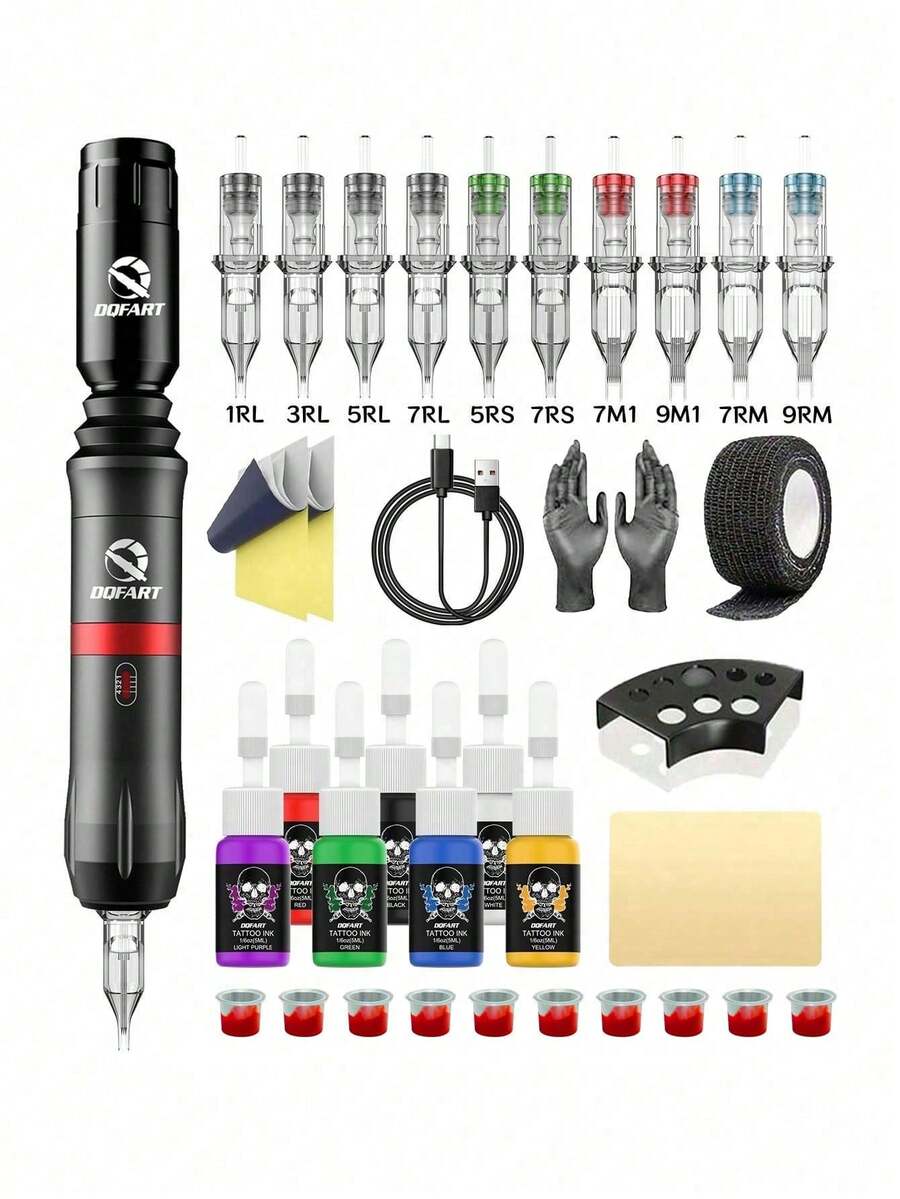 DQFART 1 Set Wireless Tattoo Gun Kit, Includes 1200mAh Power Adapter, Aluminum Alloy Tattoo Machine, And Complete Tattoo Pen Set. Suitable For Beginners And Tattoo Artists, Contains Tattoo Needles, Tattoo Ink, Practice Skin, And Various Tattoo Accessories, Applicable For Multiple Occasions.