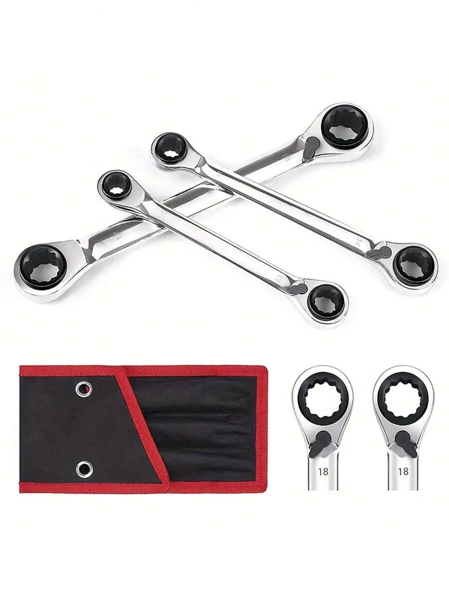 Double Head Reversible Ratchet Wrench Set Plum Quick Ratchet Wrench, Two-Way Mirror Polished Wrench Set, Four-In-One Metric Repair Tools Set Combination