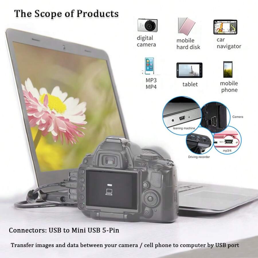 Edekoy USB-Mini5p Data Cable, Highly Compatible With Various DSLR Cameras, Direct Connection To Computer With Ultra-Fast Transfer Speed, Lightweight 60g, Portable, Black PVC Plastic Material Compatible With Canon EOS D30, D20, D10, SX60, SX520, SD110, A2500, 5DS, T6I, HF100, R300 And Other DSLR Cameras