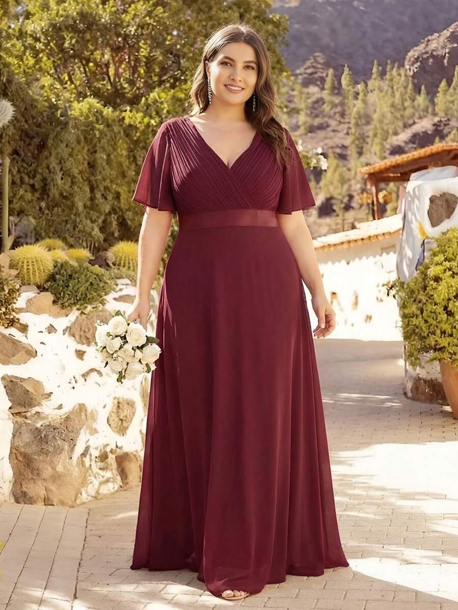 Plus Size Elegant V-Neck Ruched Bust Wine Red Bridesmaid Dress, Wedding Guest Formal Dress For Party, Mother Of Bride Dress For Wedding Dinner, Birthday, Valentine's Day