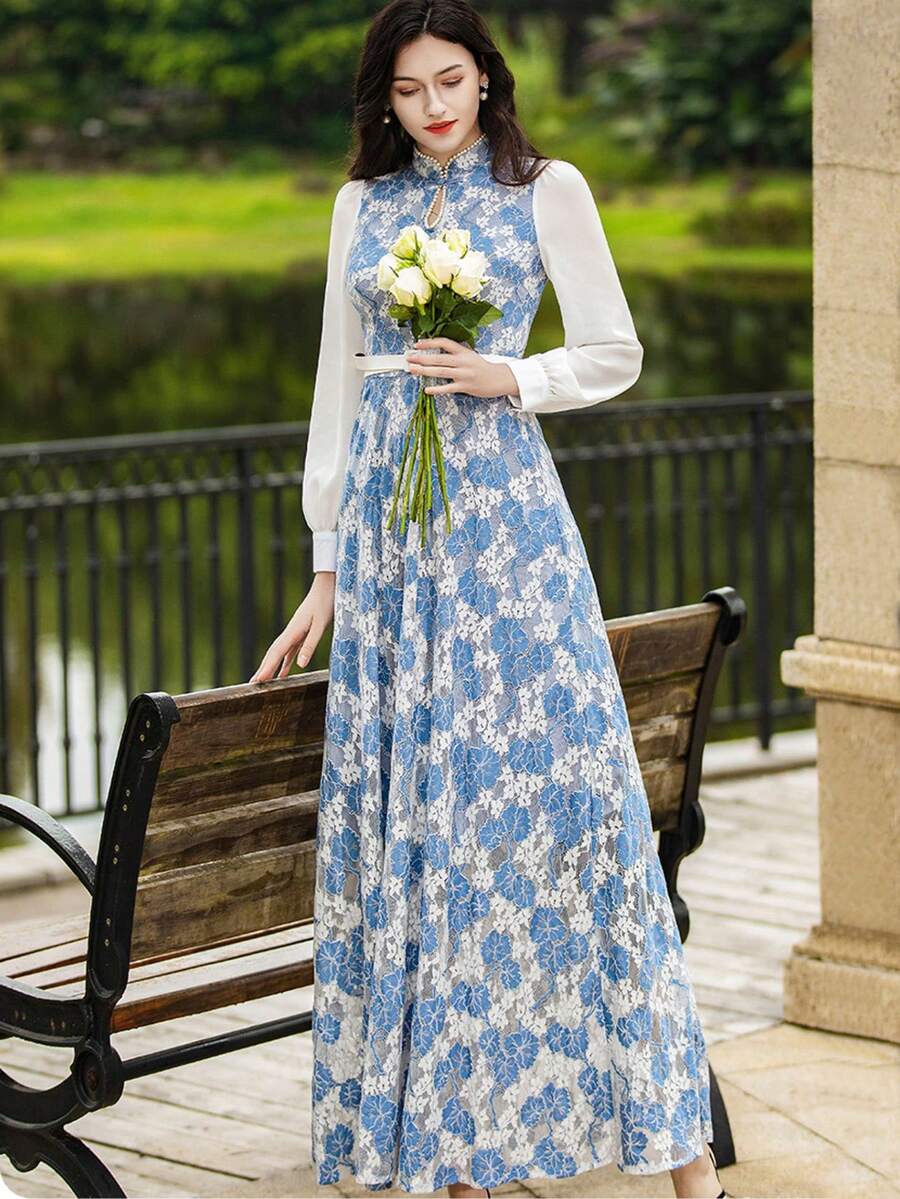 Elegant Lace Splice Heavywork Women Evening Party Dress (Belt Not Included)