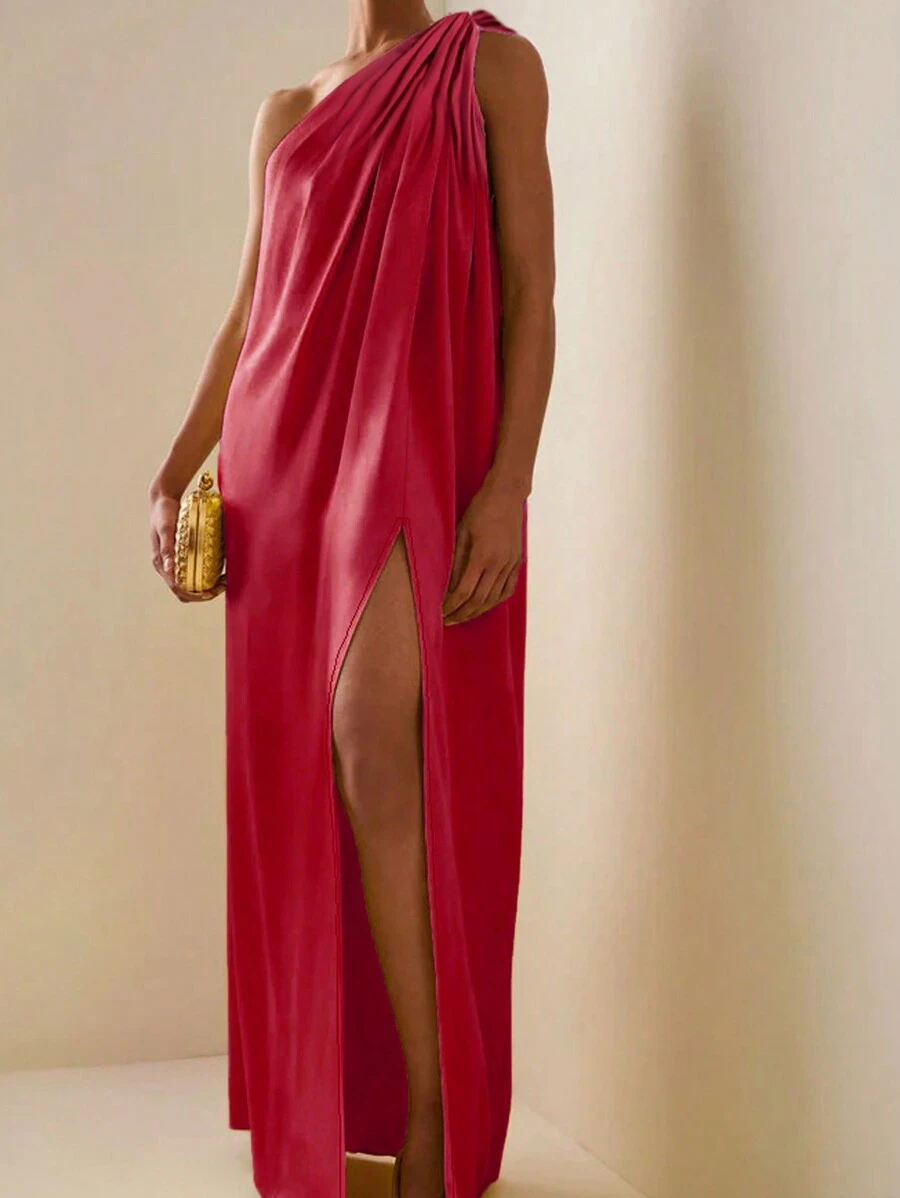 Elegant Sleeveless One Shoulder Slit Hem Solid Color Dress