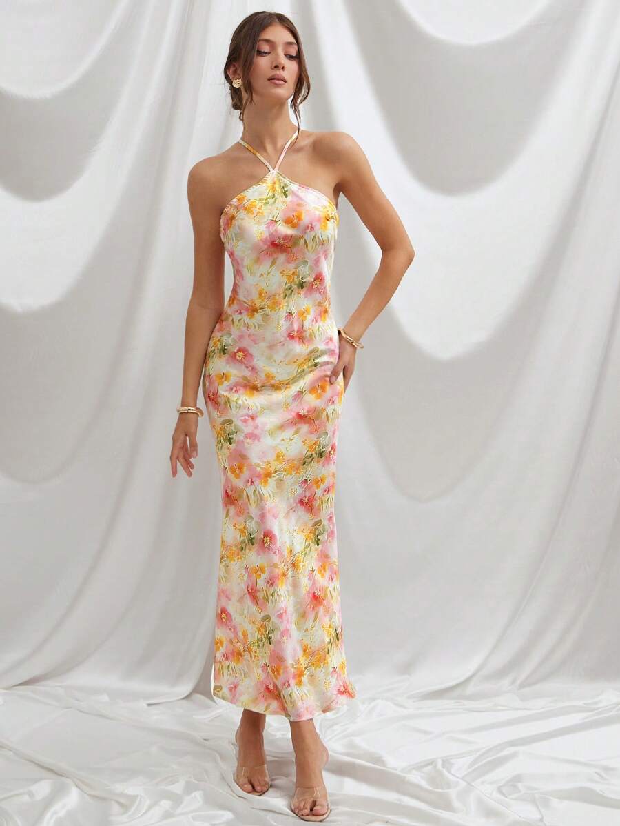 L'Amorae Elegant Floral Multicolor Satin Halter Neckline Fishtail Hem Formal Maxi Dress, Summer Outfits For Women, Wedding Guest Dress Women