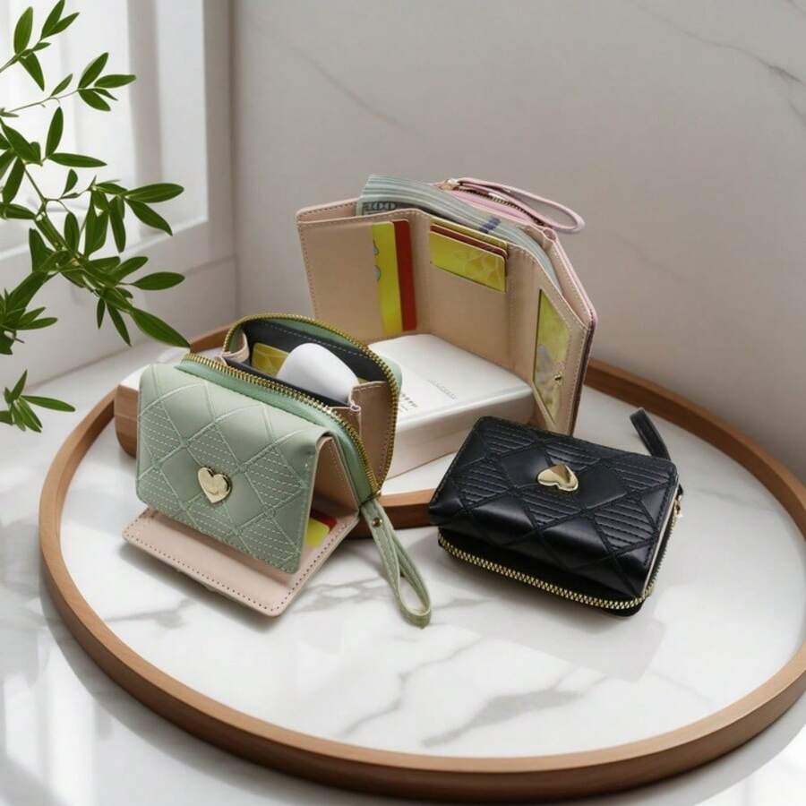 Fashion Argyle & Heart Pattern Trifold Multi-Slot Partition Multifunctional Compact Mini Wallet For Women Wallet Purse Wallet Small Wallet Cute Wallet