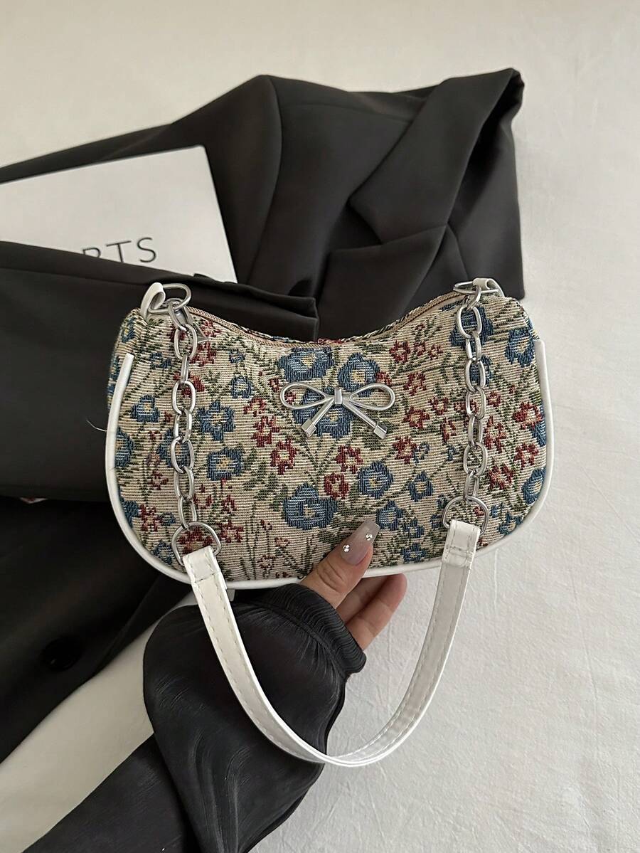 Fashion Floral Patchwork Pattern Shoulder Bag, Versatile Baguette Bag, Metal Chain Mini Bag, Underarm Bag
