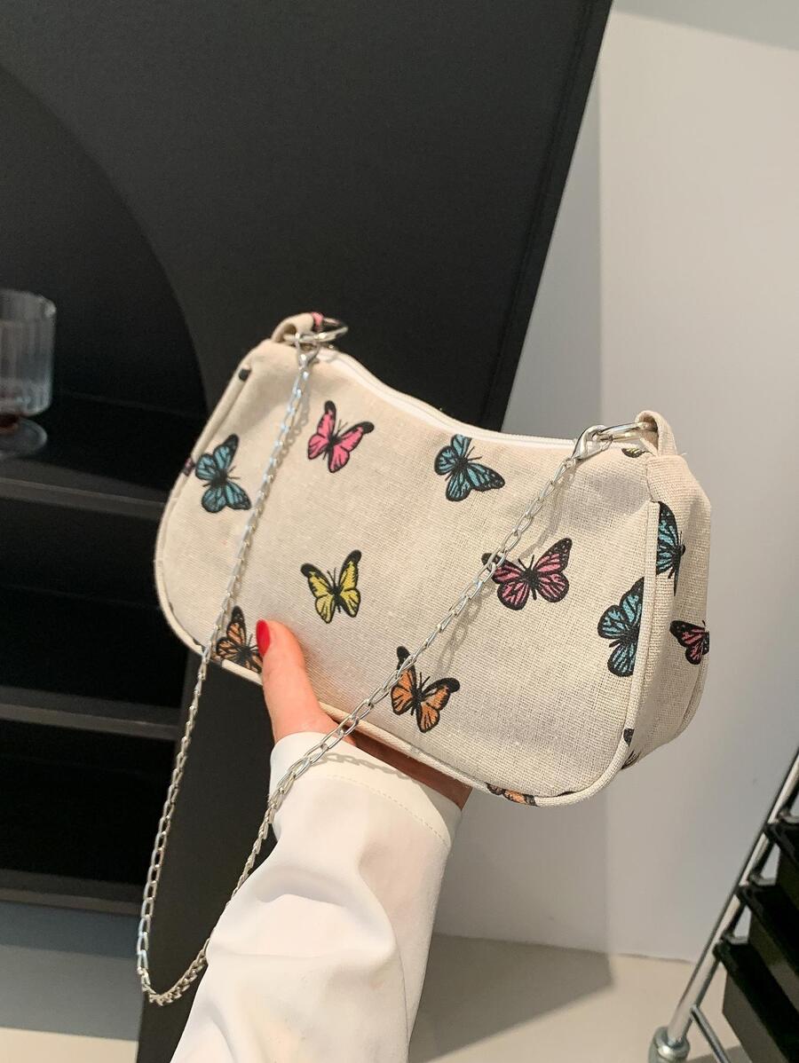 Fashionable Women's Multi-Purpose Colorful Butterfly Print Metal Chain Underarm One Shoulder Baguette Bag