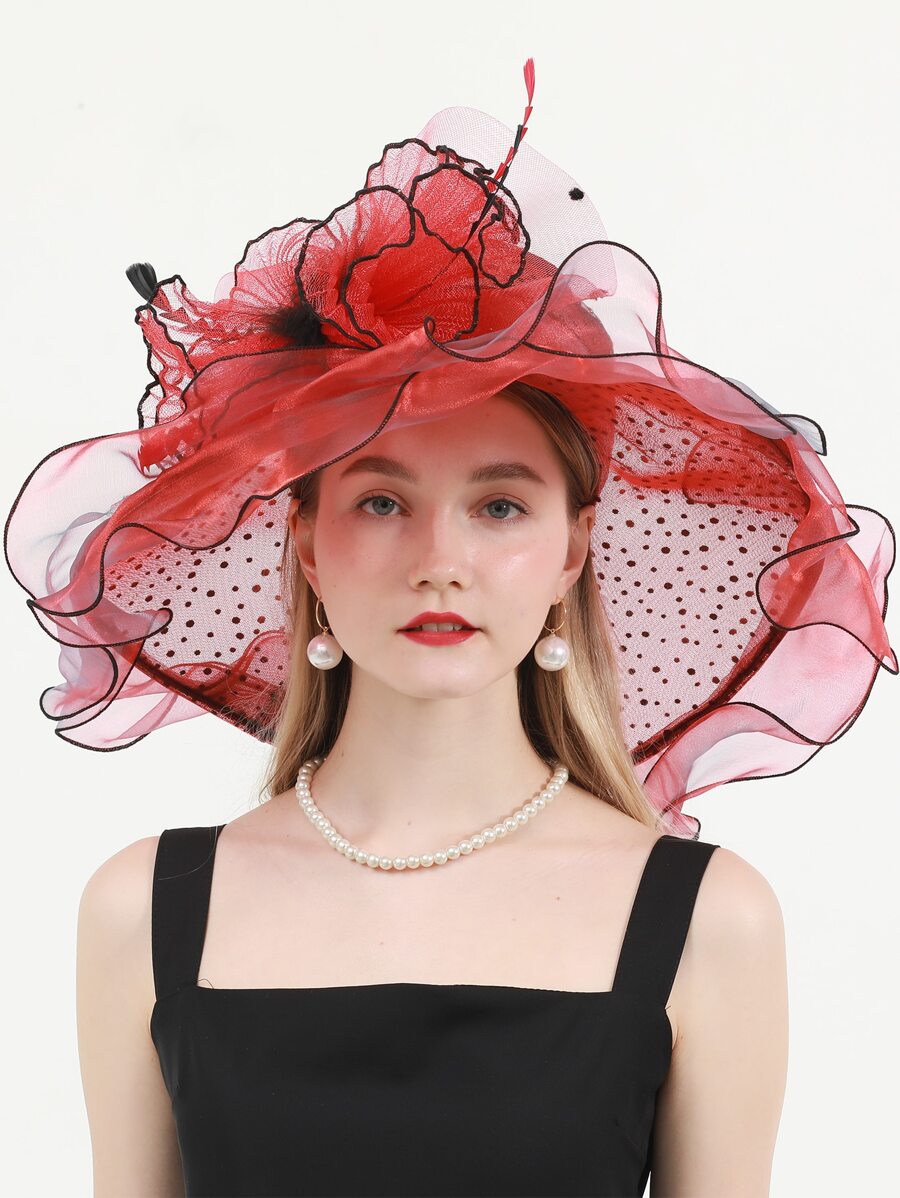 HIMESPORT Red Ladies Fascinator Hats Dots Wedding Bridal Kentucky Derby Hats For Women Flower Hats Large Wide Brim Fedora Organza Hat