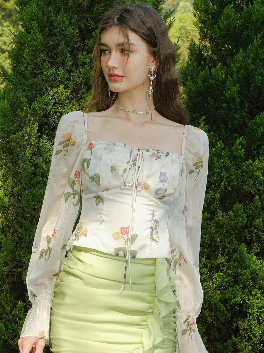 Floral Print Square Neck Tie Front Shirred Back Flounce Sleeve Blouse