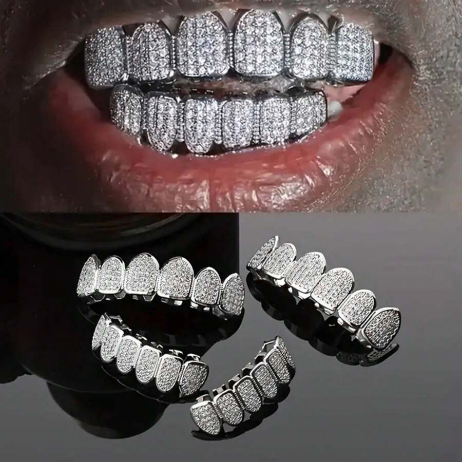 Full Zirconia Stone Tooth Grills, Unisex Gold And Silver Color Detachable Teeth Jewelry Rapper Accessories