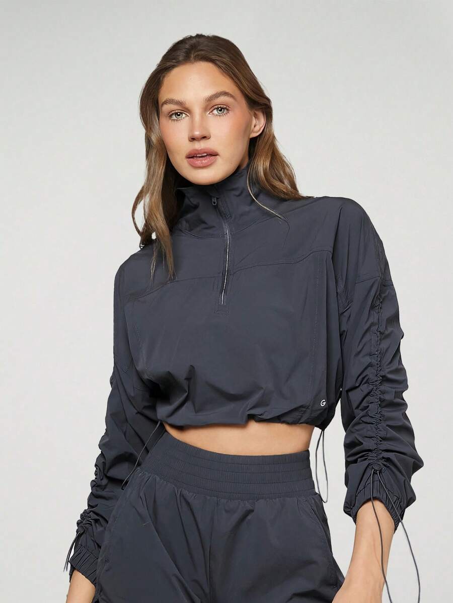 GLOWMODE Woven Airy Lightweight Loose Adjustable Sleeves Half-Zip Collar Crop Pullover Gym Workout Running