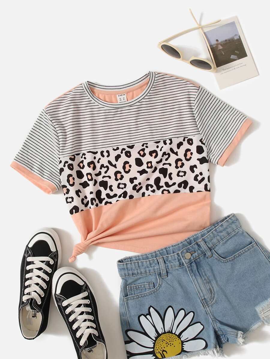 SHEIN Tween Girl Striped & Leopard Print Tee