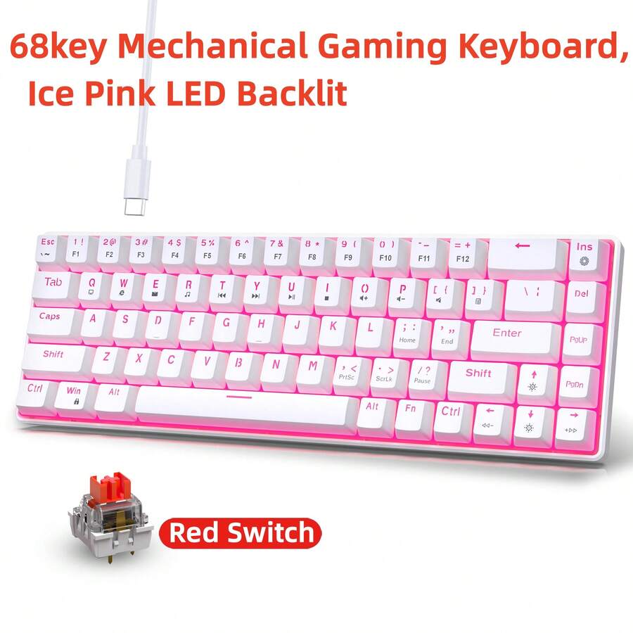 Portable 60% Percent Gaming Keyboard Mechanical, Mini Compact Pink Backlit 68 Keys Wired Office Keyboard With Red Switch For /Win
