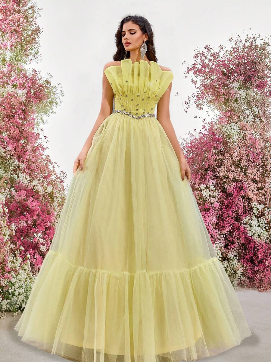 Glamrae Elegant, Romantic, Dignified, Sweet, Fashionable, Yellow, Mesh Fabric, Rhinestone Chain Decoration, Fan-Shaped Three-Dimensional Decoration, Pleated Decoration, Large A-Shaped Dress, Multi-Layered Mesh, Suitable For Vacation, Festival, Wedding Guests, Birthday Party, Dance, Formal Dinner Dress, Evening Dress, Gown,Graduation,Graduation Dresses For Women,Back To School Dress