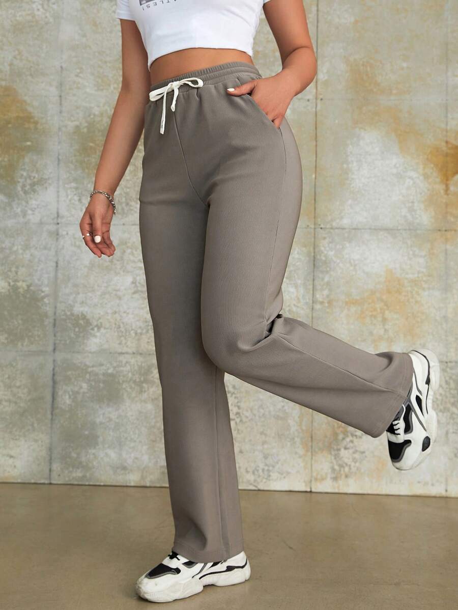 High Waist Drawstring Waist Slant Pocket Straight Leg Pants