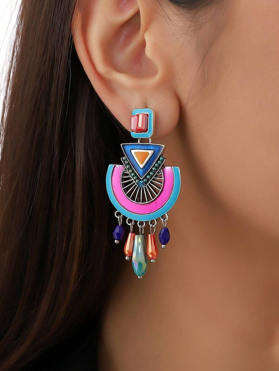 1 Pair Handmade Bohemian Enamel Crystal Drop Earrings, Floral Pattern And Color Placement Are Randomly Designed, Slight Variations In Shape And Hue