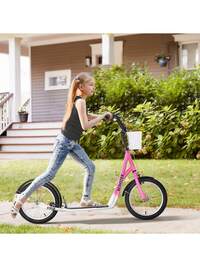 HOMCOM Kids Scooter, Kick Stunt Scooter With Adjustable Handlebar, Dual Brakes, Basket, Cupholder, Mudguard, 16" Inflatable Rubber Wheels, For 5-12 Years, Pink