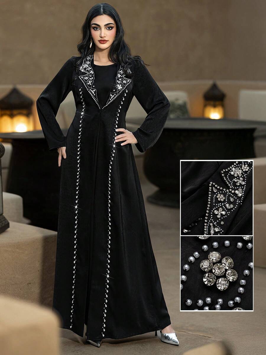 Layrah Rhinestone Embellished Handmade Long Abaya Jacket With Suit Collar Luxury Clothes For Women Sparkly Black Dress For Evening Party