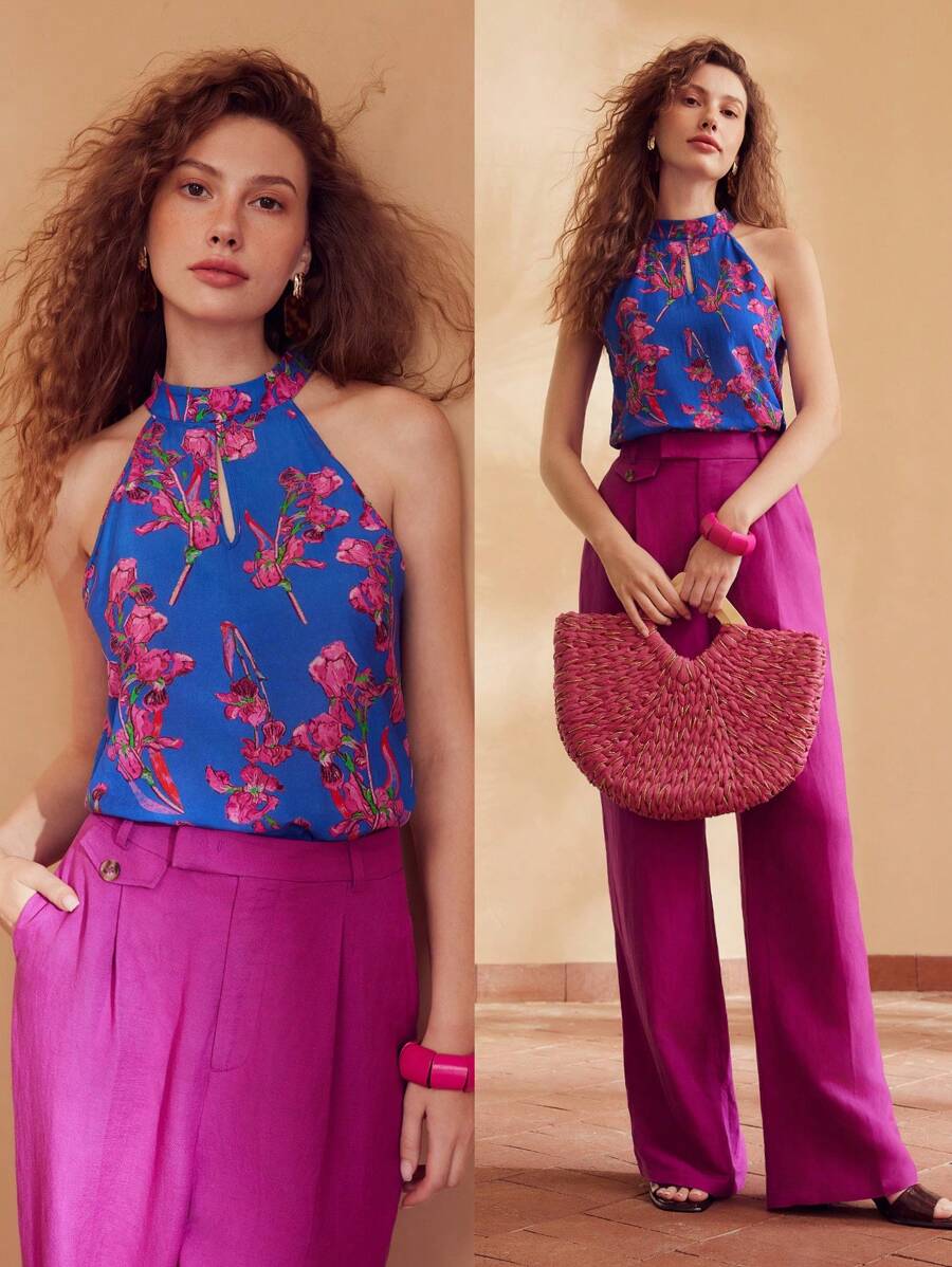 MOTF PREMIUM LINEN FLORAL PRINT HALTER NECK BLOUSE