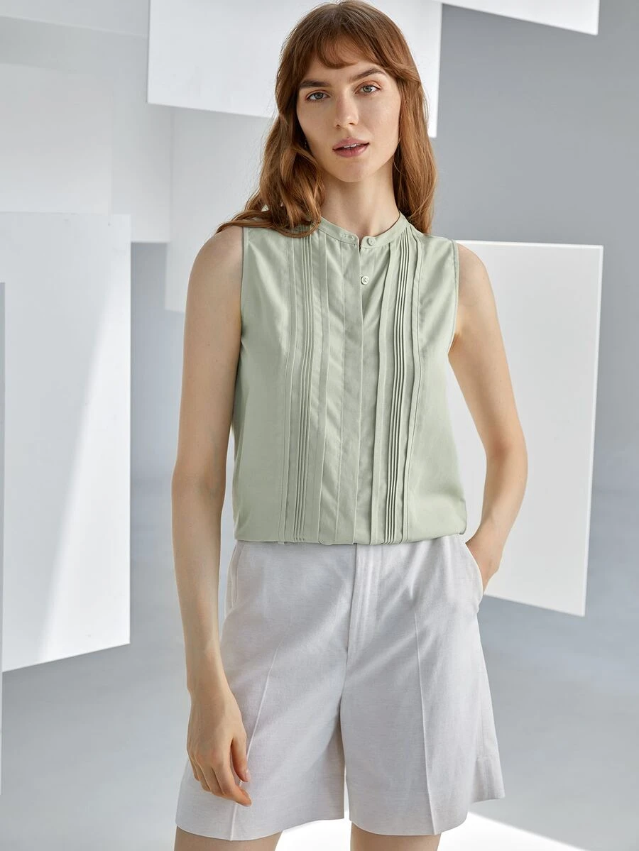 MOTF PREMIUM LINEN MOCK NECK PLEATED BLOUSE