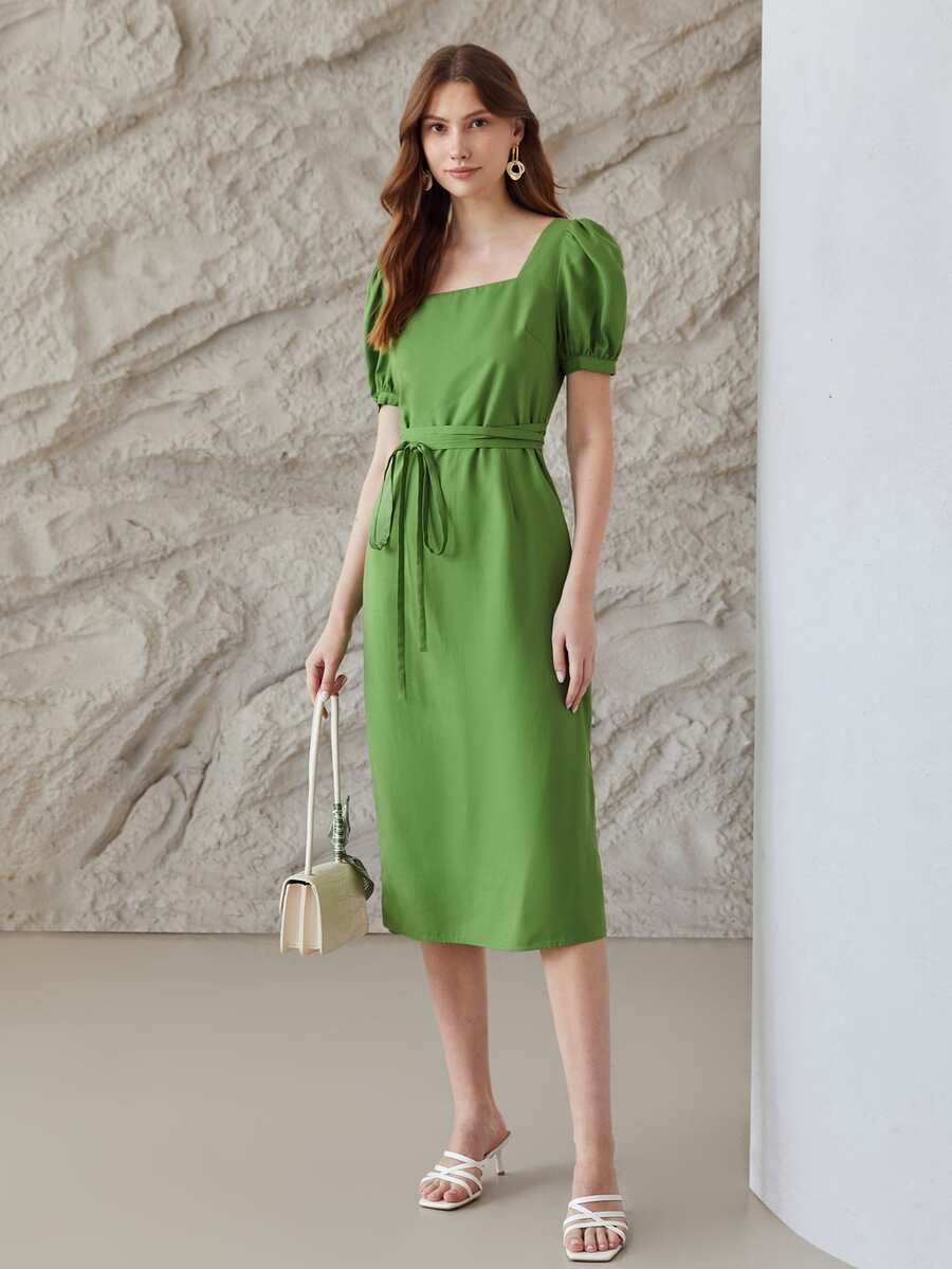 MOTF PREMIUM LINEN PUFF SLEEVE BELTED DRESS