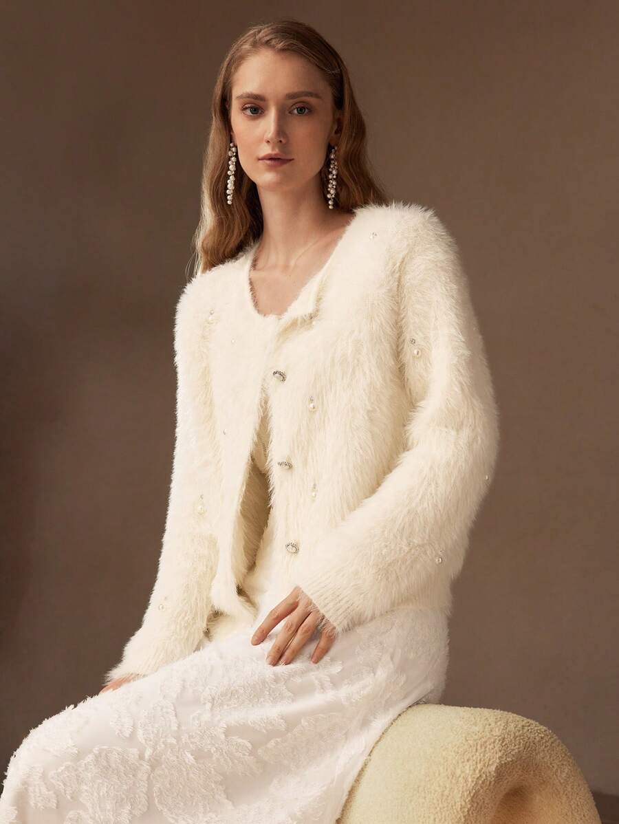 MOTF PREMIUM SOLID FAUX PEARL DETAIL FLUFFY KNIT CARDIGAN