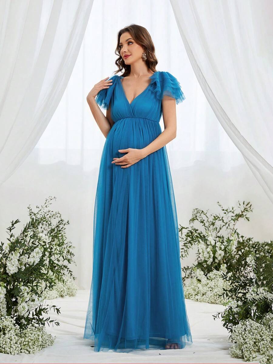 Maternity Plunging Neck Ruffle Sleeve Slit Mesh Party Elegant Dress